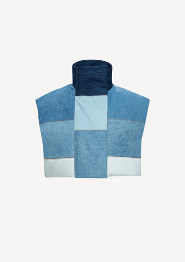 Add a trendy touch to your wardrobe with this light denim patchwork puffy vest. Its cropped design and stylish turtleneck make it perfect for any casual outfit. Complete the look with our matching jeans, shorts, or shirt for a fashion-forward ensemble.