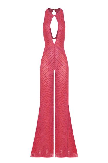 Flaunt your glamorous style in this sleeveless jumpsuit featuring a 3-color stone trim and alluring chest and back cut-outs.