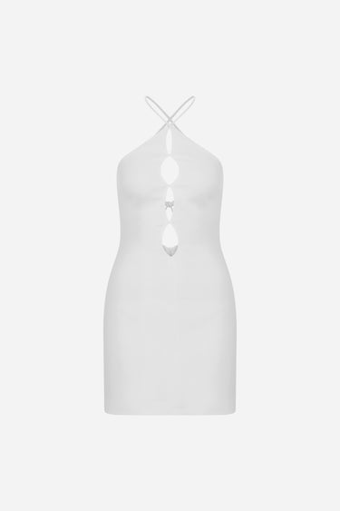 Look unstoppable in this aesthetic white mini dress. The precise cuts and vibrant color highlight your natural body.