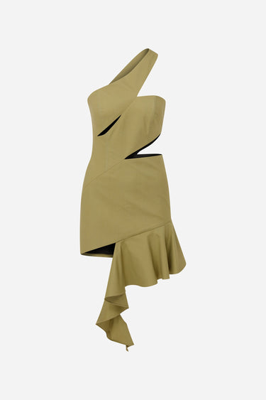 Elevate your party look with our ILA ARIA One Shoulder Mini Dress! Made with a unique asymmetrical design and flounced panel, this khaki dress will surely make you stand out. Perfect for those who love extravagant fashion!