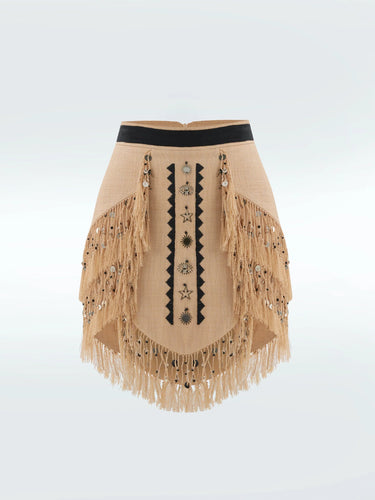 Featuring intricate wire threading technique and handcrafted metal sequined fringes, our IRIS skirt is a true work of art! Each piece is carefully embellished by our all-woman team in the vibrant southeastern region of Anatolia, bringing unique and authentic elements to your wardrobe. Experience the beauty and craftsmanship of traditional techniques with this statement-making mini skirt.