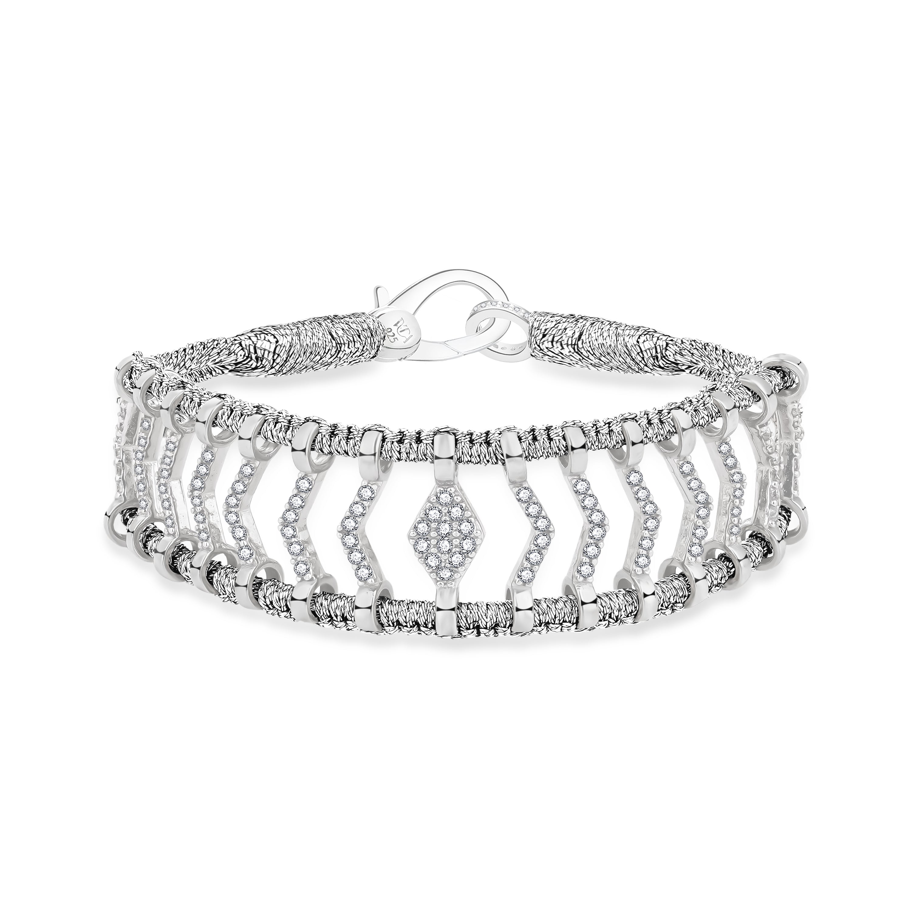 This bracelet in candy color thread will be your bohemian lucky summer. It is decorated with an openwork pattern in silver fully set with moissanites, which gives this piece a definitely precious look that you will love. Choose a size 1cm higher than the measure of your wrist.