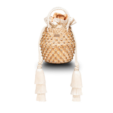 Let the tassels do the talking! The juxtaposition of natural raffia, sparkling clear crystals, and sumptuous white silk ensures that this Carol complements your perfect wedding outfit.