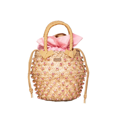 This Nina is a girl’s best friend, pairing natural raffia with pink cotton with rose-coloured crystals. Standing 18 centimetres tall, she comfortably holds your phone, keys, wallet, and lip gloss.