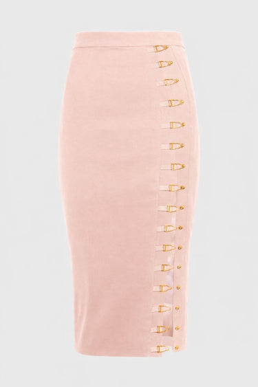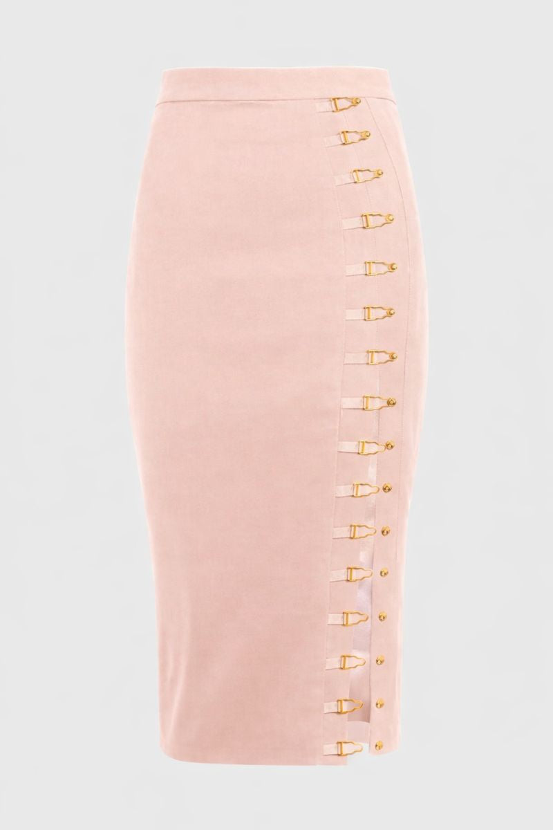 Not just a skirt, but a royal experience. This bodycon timeless skirt has a bold slit on one leg. It's decorated with our beloved suspender-inspired golden details that beautifully curve to the body.
