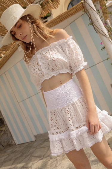 This feminine skirt is crafted from a cotton fabric with embroidered flower. It has small ruffles at the bottom that add a bit of volume and shape. Thanks to the elastic smock around the waist, it will adjust to your silhouette. Wear it with the Cloe or Ashley matching tops for a total look or with a basic white top.