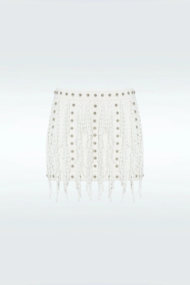 The intricate embroidery and playful fringe details on this skirt add a touch of whimsy and boldness to your wardrobe. The metal accents are a unique and eye-catching touch that will make you stand out wherever you go! Dress to impress with this statement piece!