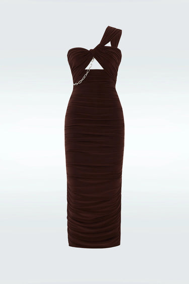 Indulge in luxury and sophistication with our Zeynep Tosun Electra Dress Brown. Featuring a stunning one shoulder design and delicate chain details, this midi jersey dress exudes timeless elegance. Elevate your look and make a statement at any occasion with this exclusive and tasteful piece.