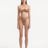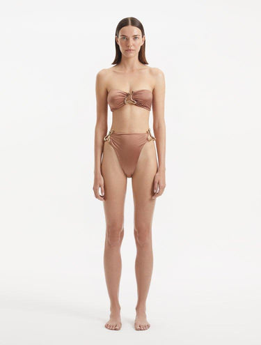 Unlock the gold standard of style and comfort with this bandeau style bikini. The sophisticated sculpted accessory detail adds a touch of luxurious quirkiness to your beach look. Plus, the self tie back and ruched detail provide a flattering fit that will make you feel confident and carefree all day long. (We can't promise you won't want to wear it off the beach too. Go ahead and make it your new favorite party top, we won't judge.)