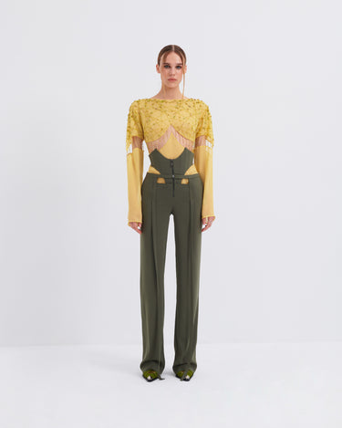 Indulge in the graceful beauty of this chiffon blouse, adorned with intricate hand-embroidery on the upper body and sleeves. The unique design is complemented by a visible back zip closure, adding a touch of effortless elegance to your wardrobe. With a concealed back zip, this blouse exudes a sense of exclusivity and refinement.
