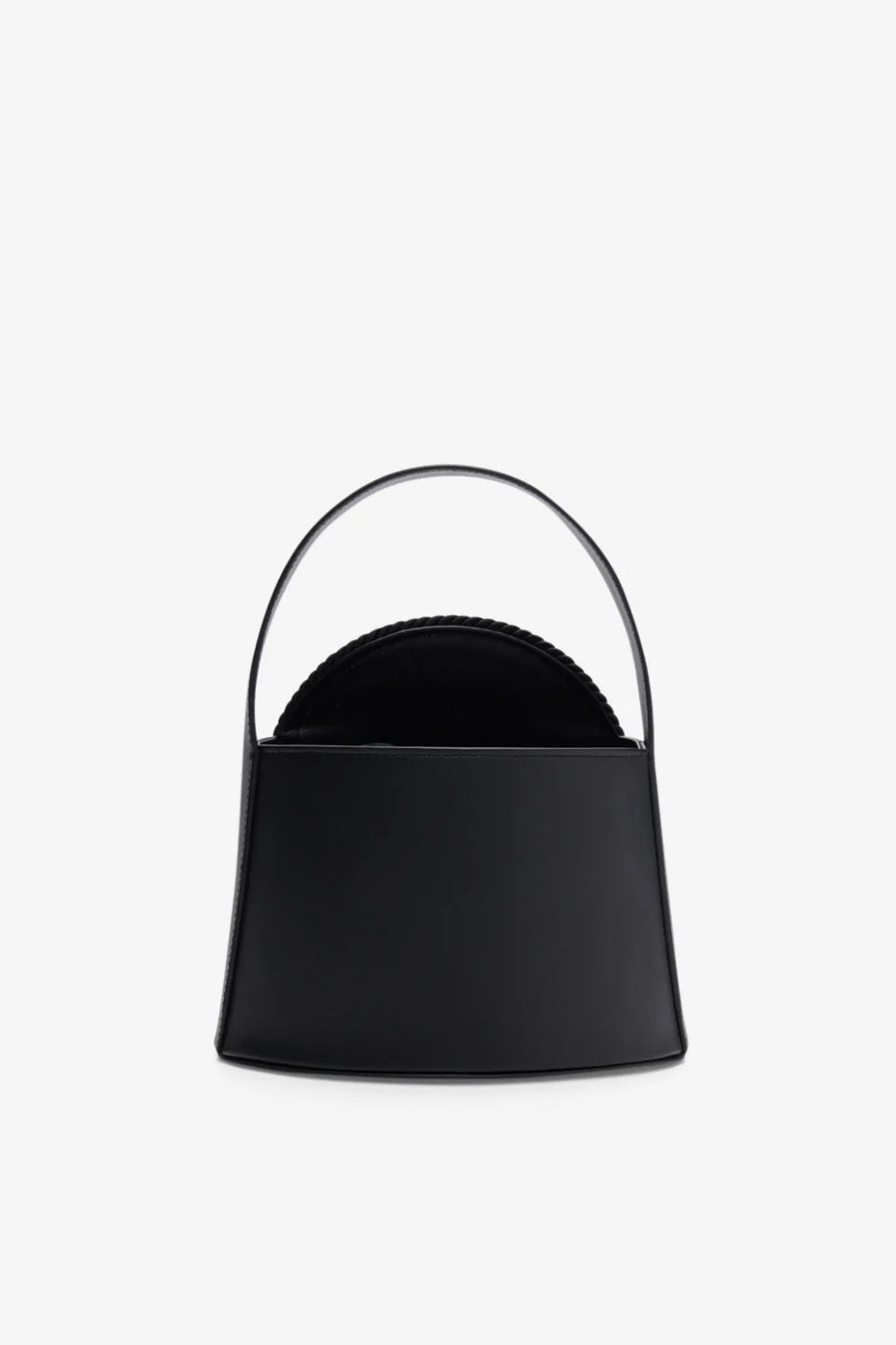 Crossbody bag balancing structure and fluidity. A sculptural silhouette punctuated by a tonal passementerie circle.