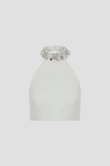 Embrace effortless style with this elegant halter neck top adorned with delicate star-shaped accents. Elevate your wardrobe with this sophisticated and exclusive piece, perfect for making a statement at your next social event.