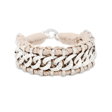 This sublime bracelet made of thread vanilla color and decorated with a silver motif resembling a chain with imposing links. The silver structure is set with more than 800 diamonds.