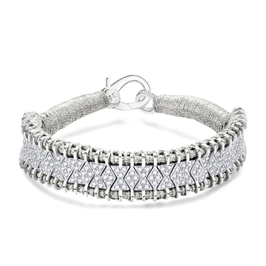 This Silver-colored thread bracelet will be your summer bohemian lucky charm. It is entirely decorated with silver forming diamonds alternating with hourglasses which compose a pattern chart. The silver structure is entirely set with diamonds, which gives this piece a definitely precious look that you will love.