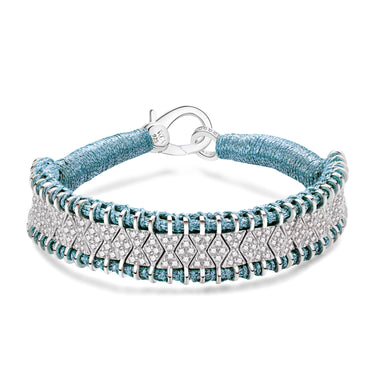 This light blue thread bracelet will be your summer bohemian lucky charm. It is entirely decorated with silver forming diamonds alternating with hourglasses which compose a pattern chart. The silver structure is entirely set with diamonds, which gives this piece a definitely precious look that you will love.