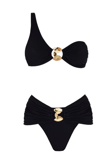 It is a simple asymmetrical black bikini top embellished with one detail that transforms it into a showpiece. The golden detail of the Lilla black swim top will make you feel like wearing jewelry. The gold hardware sits at the keyhole center, illuminating your surroundings. It was inspired by the movements of water in the ocean and the sand patterns at the beach. All accessories used by MOEVA are rust-free, don't heat under the sun, and are suitable for swimming. So, you don't need to worry about damaging your garment; we have it covered.