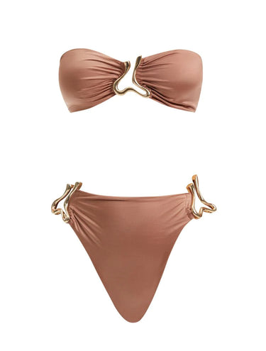 Add a touch of elegance and sophistication to your beach look with the Moeva CLYDE Bikini Top. Featuring a stunning bandeau style and gold sculpted accessories, this top is guaranteed to make you stand out. The self-tie back and ruched details add a flattering touch, while the high-waisted design is both stylish and comfortable. Made with special Lycra Xtralife fabric, this top is not only fashionable but also durable. Don't miss out on this must-have addition to your swimwear collection!