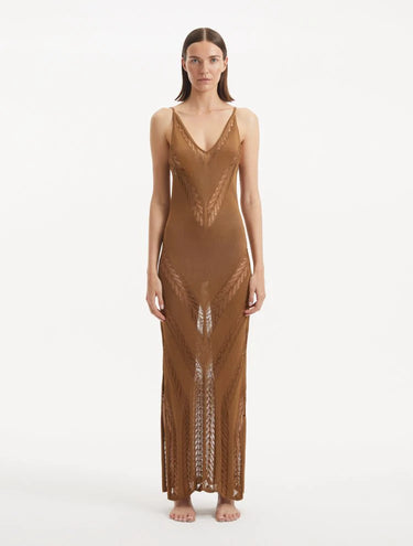 The softness of the knit molds beautifully to your body, accentuating your silhouette while maintaining an airy, weightless feel.The scoop neckline is a timeless choice that brings a sophisticated femininity to the dress. The enticing cut not only flatters your neck and collarbones but also paves the way for the beautiful jewelry you might choose to adorn.Stretching down to ankle length, the dress evokes an image of a tranquil evening stroll along a sandy beach, the hem of your dress lightly brushing against your ankles.