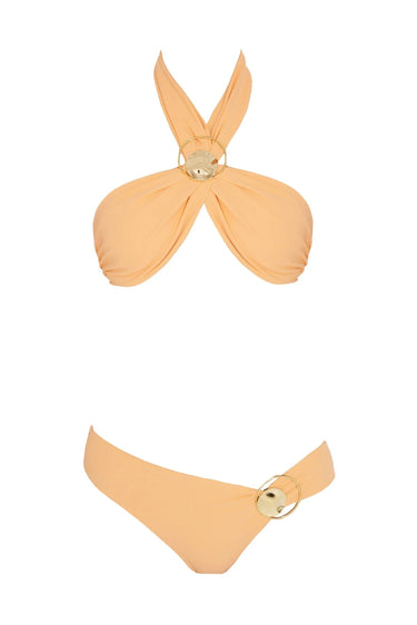 The unique Piera bikini top is accentuated with adjustable gold sculpted hoop accessory at the front. The ocean waves and sand dunes influence the surface of the gold hardware. It is rust-free, doesn’t heat under the sun, and is suitable for swimming. Piera tie-back bikini top contours the figure for an alluring silhouette. You’ll love the quick-drying Italian fabric that feels like a second skin. Piera orange padded swimsuit top with a gold accessory will fit perfectly with removable paddings and gold clasps at the back.