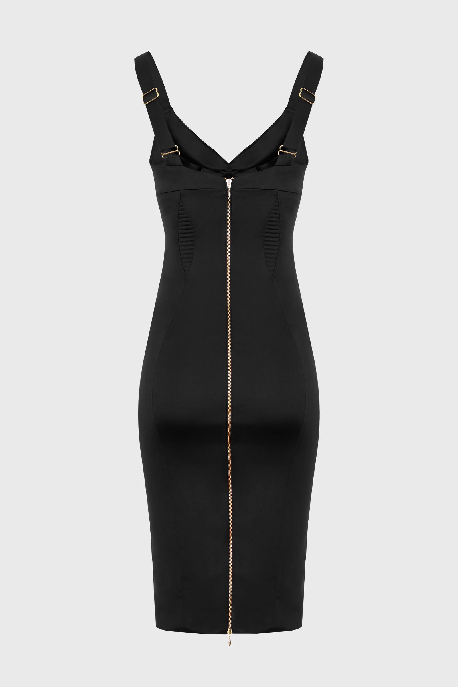 The sensual neckline adjusts with fine straps, while the double back zipper can transform into a daring slit, as bold as you choose. The bust is shaped with feminine support, while the soft lining caresses the skin, completing the experience of wearing it.