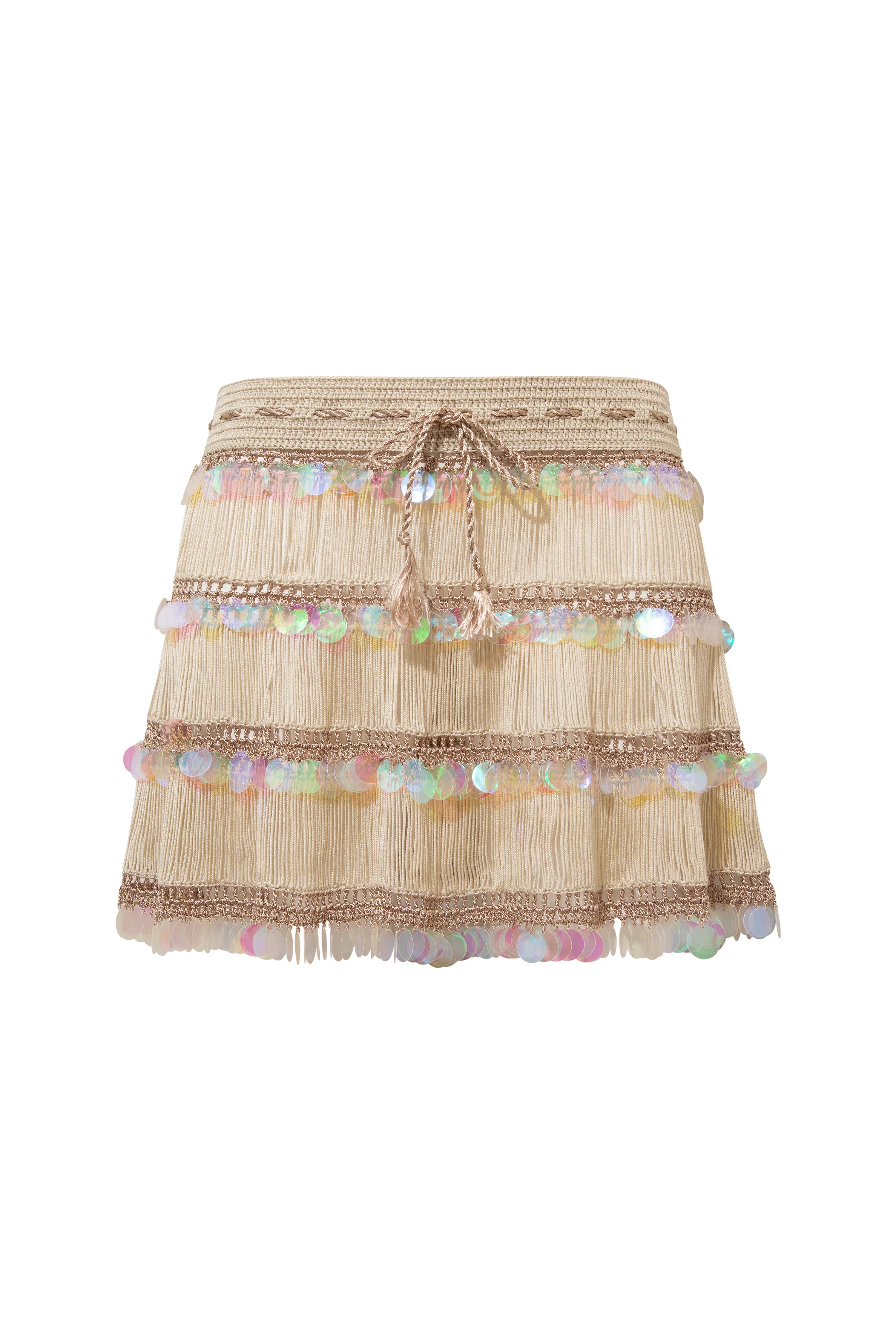 A captivating crochet mini tiered skirt, adorned with shimmering sequin accents that add a touch of playful glamour. Crafted in a soft, versatile hue, this skirt radiates a bohemian elegance that effortlessly enhances your wardrobe. Featuring a comfortable drawstring waist, it offers easy styling for any occasion. Pair it with bikinis for a carefree beach day, simple tops for casual outings, or chic blouses for a refined look. Experience the perfect harmony of comfort and style with this sparkling addition to your summer collection.