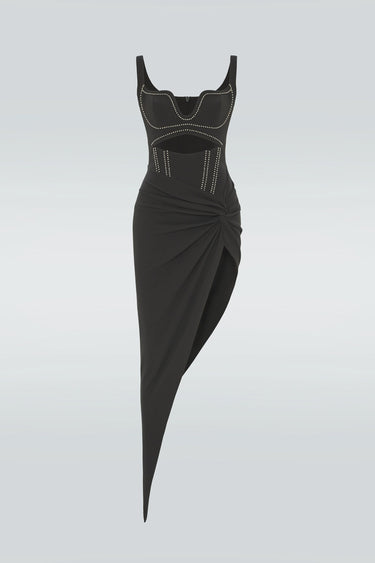 Dress to impress with this stunning midi dress. The corset detailing accentuates your figure while the slit and hand embellishments add a touch of glamour. It's a luxurious piece adorned with metallic beads that exudes elegance and sophistication. Step out in style and make a statement with this dress.