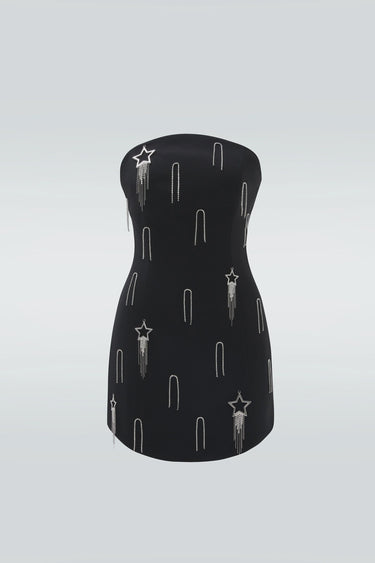 Indulge in luxury and glamour with our Zeynep Tosun Star Shower Dress. Adorned with intricate strass and metal accents, our strapless mini dress is a true work of art. Perfect for special occasions, this dress will have you feeling like the star of the night with its exquisite detailing and sophisticated design. Elevate your wardrobe with this exclusive piece and showcase your impeccable sense of style.