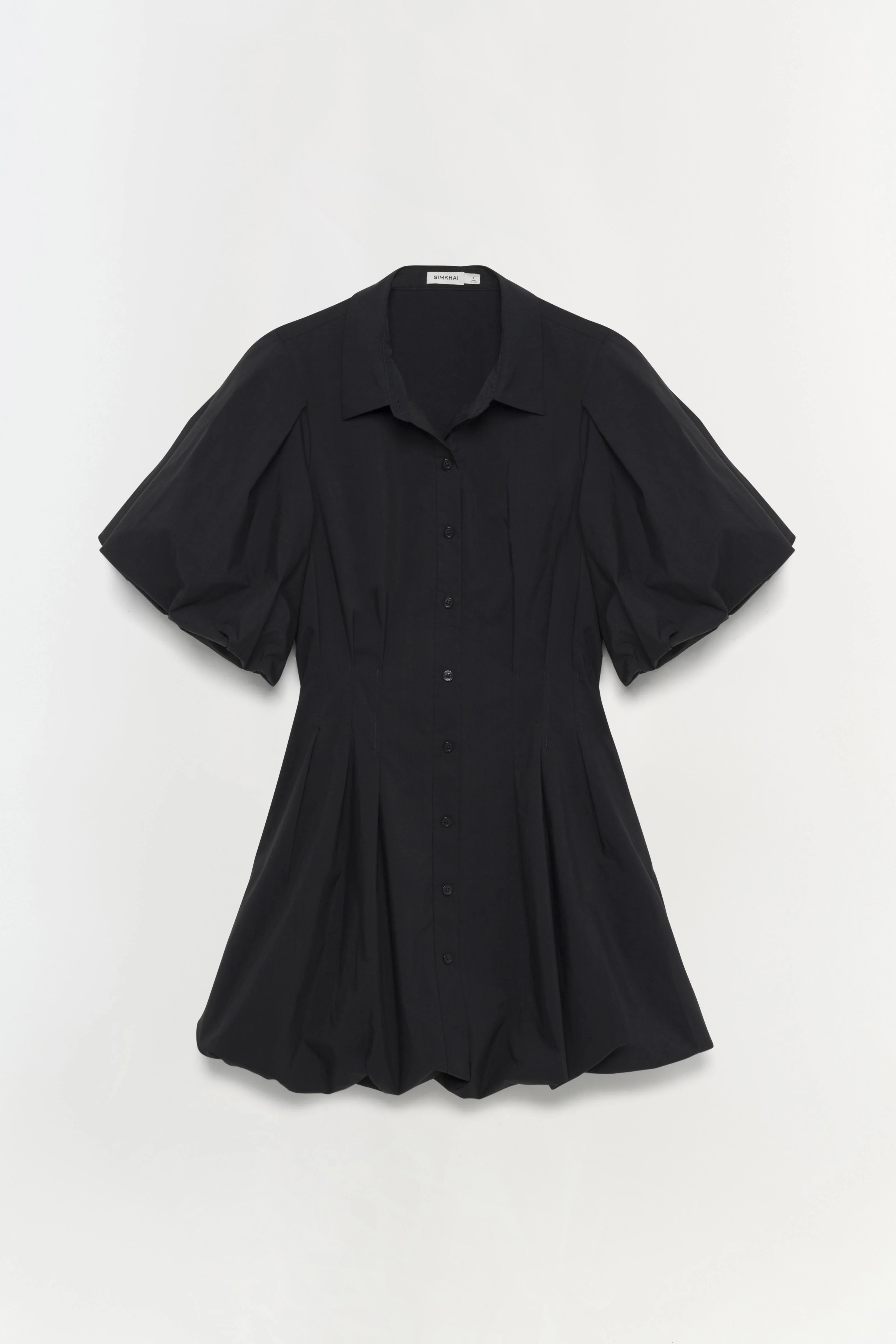 Signature Cleo Mini Dress in Black. The everyday ease of cotton poplin, crafted into a pleated mini dress with ballooned sleeves and a slimming, pintucked waist. A Jonathan Simkhai signature.