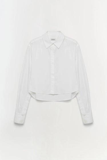 The Renata Shirt in White. Elevate your wardrobe with this crisp cropped button-down. Designed with a sharp collar and a clean front, its tailored fit provides a sophisticated silhouette. Perfectly versatile, it's a modern staple for both casual and dressier ensembles.