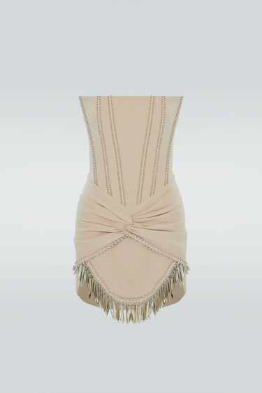 Experience the epitome of elegance with our Zeynep Tosun Tassel me up Dress in beige. Hand-embellished with luxurious metallic beads and delicate tassels, this strapless mini dress exudes opulence and refinement. The perfect addition to your wardrobe for special occasions, this dress will make you feel like a true fashion icon. Elevate your style with this tassel-adorned masterpiece today.