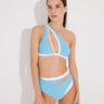 The ethereal blue of the Vermillion collection is a soothing color. It is the color of the calming blues of water during sunset. The cooling blue combined with the crisp white brings freshness to your favorite bikini top. Wear the peachy Etta blue swim top this summer to display excellent taste.
