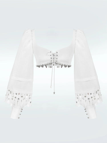 Get ready to turn heads with the Zeynep Tosun IRIS Bustier! Our woman teams in southeastern Anatolia use their incredible talent to handcraft every metal sequined crochet and fringe embellishment. The result is a stunning and unique bustier that you can adjust to your perfect fit. Feel confident and stylish in this one-of-a-kind piece that is sure to make you stand out from the crowd.