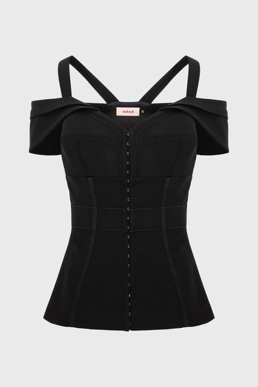 The corset that embraces the body and turns it into a statement of unapologetic femininity. Crafted from luxurious cady, with clean lines and off-shoulder sleeves revealing the shoulders, it is defined by the front zipper that draws a strong, sensual silhouette. A rare piece, designed to turn every moment you wear it into a memorable appearance.