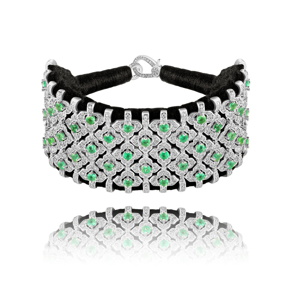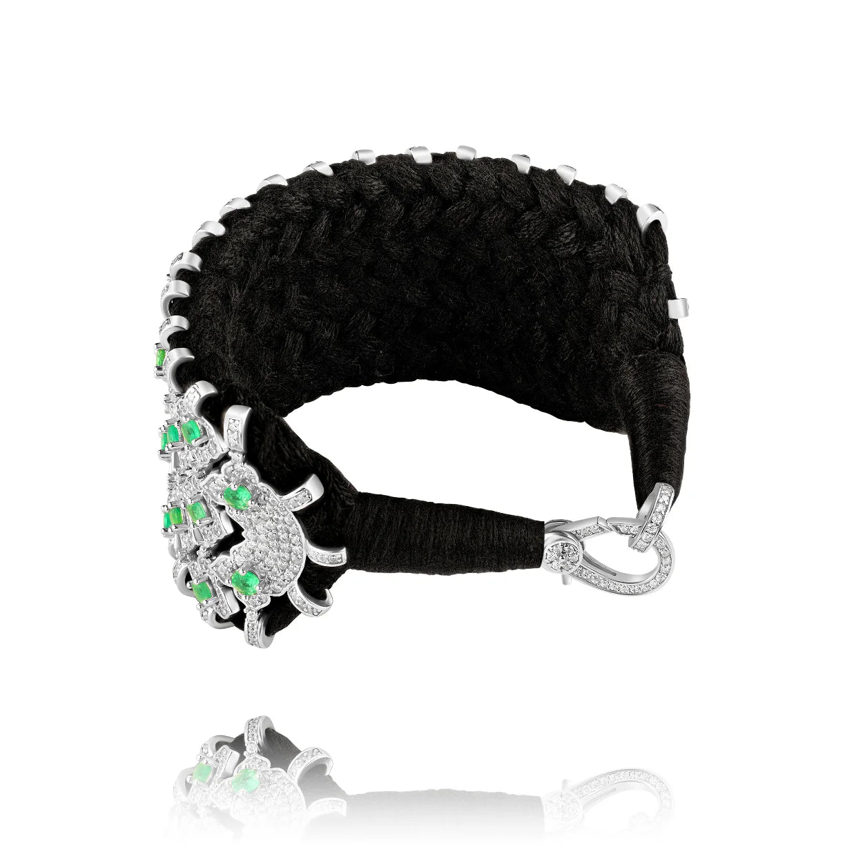 Large cuff made of black-colored braided cotton thread decorated with a 925 silver structure entirely paved with diamonds and emerald stones.