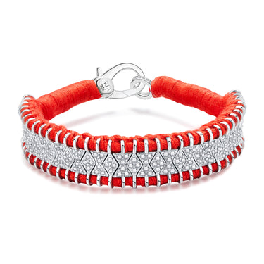 This red thread bracelet will be your summer bohemian lucky charm. It is entirely decorated with silver forming diamonds alternating with hourglasses which compose a pattern chart. The silver structure is entirely set with diamonds, which gives this piece a definitely precious look that you will love.