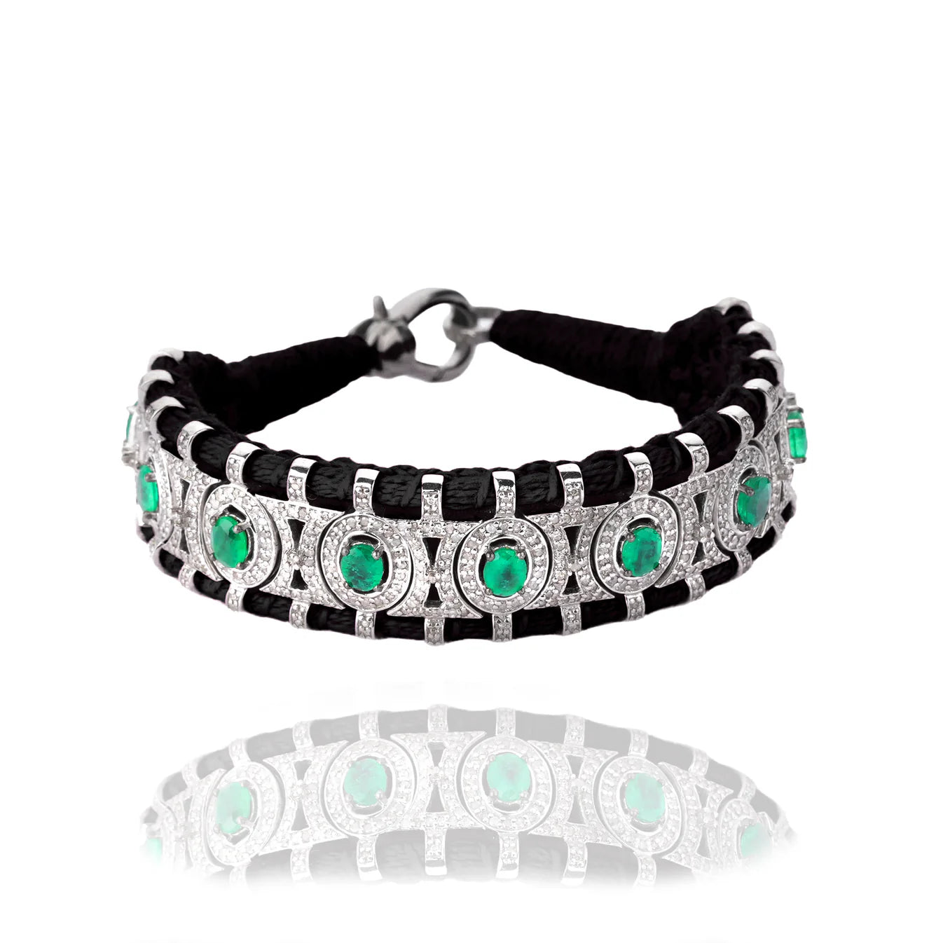This thread bracelet black color will be your bohemian lucky charm for the summer. It is entirely decorated with silver forming an oval pattern set with more than 300 diamonds. Each small oval is beautifully decorated with a central emerald. It will forever be your friendship bracelet with its precious style and will never leave your wrist.
