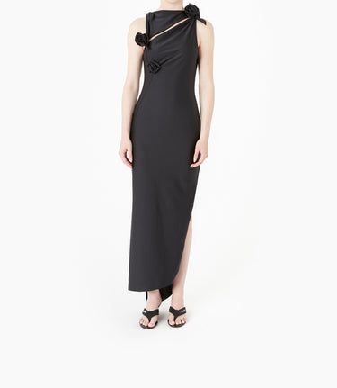 A refined evolution of the Asymmetrical Flower Gown. Coperni’s sculptural codes fall just below the knee. Crafted from smooth technical jersey with a fluid, body-skimming stretch, it showcases the brand’s signature petal knots at the shoulder and waist. The clean asymmetric neckline and elongated mini hem create a balanced, modern line.