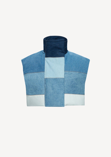 Add a trendy touch to your wardrobe with this light denim patchwork puffy vest. Its cropped design and stylish turtleneck make it perfect for any casual outfit. Complete the look with our matching jeans, shorts, or shirt for a fashion-forward ensemble.