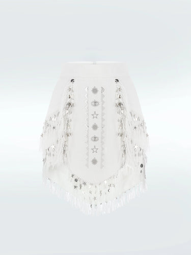 Embrace your inner goddess with our Zeynep Tosun IRIS Skirt. Adorned with intricate wire threading and handcrafted metal sequined fringes, each piece is lovingly created by our talented and dedicated teams of women in the Southeastern Anatolia region. Feel empowered and beautiful as you make a statement with this unique and luxurious skirt. Elevate your style and support women artisans with every step you take.
