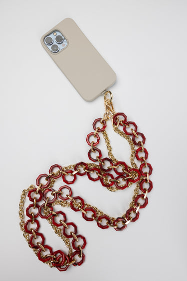 Introducing our Red and Gold Phone Strap - the perfect accessory for stylish and comfortable phone carrying. Made from smooth acrylic, this strap adds a touch of luxury to your daily routine. Say goodbye to bulky pockets and hello to effortless phone carrying! (Strap only, phone not included. Sorry!)