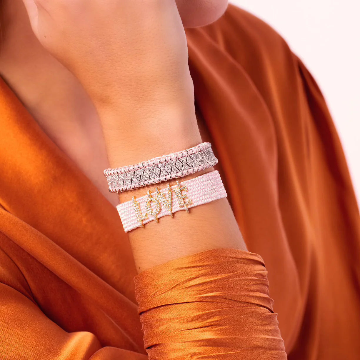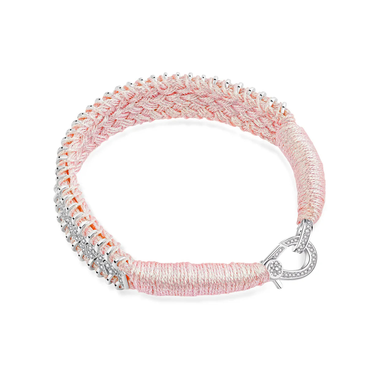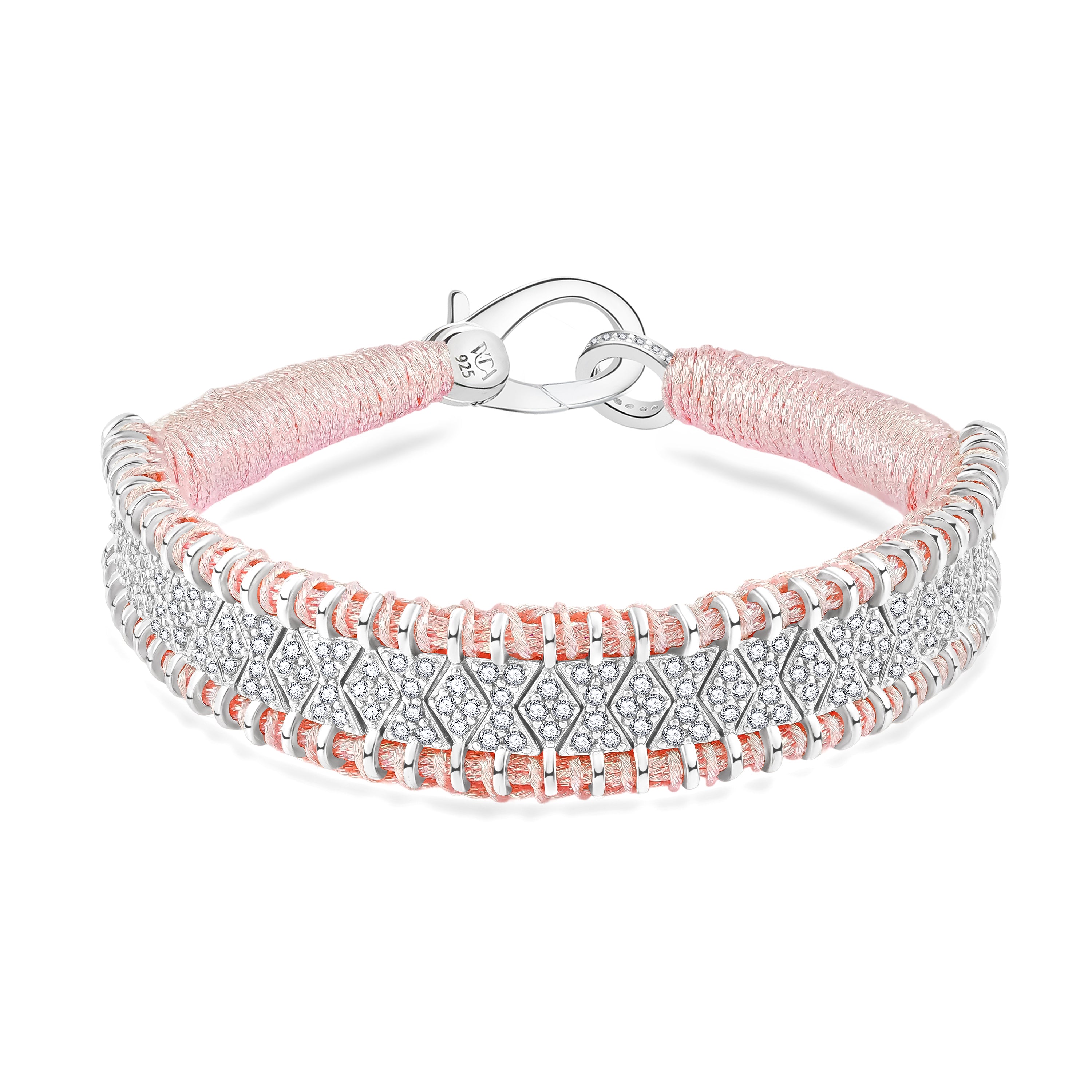 This unicorn-colored thread bracelet will be your summer bohemian lucky charm. It is entirely decorated with silver forming diamonds alternating with hourglasses which compose a pattern chart. The silver structure is entirely set with diamonds, which gives this piece a definitely precious look that you will love.